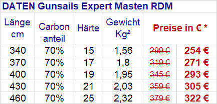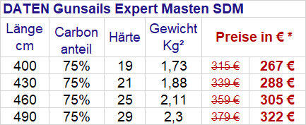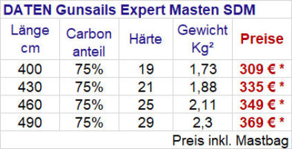 Gunsails Expert MastenPerformanceorientierte Mastlinie mit einem Carbonanteil von 70 % bis 75 % .Die Expert Linie mit einem Carbonanteil von 70% bis 75% ist für performanceorientierte Surfer und für alle die es gerne leicht aber auch bezahlbar haben möchten erste Wahl.Die Grössen ab 430 als SDM Variante haben 75 statt 70% Carbonanteil um die freerideperformance bei den grösseren Segeln hervorzuheben, da man mit dem höheren Carbonanteil eine bessere Rückstellkraft und Twistdynamik erzielt.Alle Expertmasten werden in der hochertigen PrepregCarbonbauweise gefertigt und haben eine Gewährleistung von 24 Monaten. Bei Uns die am meisten verkaufte „Standartmastlinie“, da die gunsails Segel und auch Masten im Vergleich zu anderen Marken recht günstig sind werden gerne die Expertmasten gekauft.Diese haben auch ein tolles Gewichts/ Preisverhältniss und mit dem hohen Carbonanteil auch eine sehr gute Performance; auch als Rigg- Upgrade interessant….Trotz des niedrigen Gewichtes sind die Masten ausreichend stabil, die Masten sehr zuverlässig.Ausführliche Infos zum Thema RDM oder SDM Mast sowie Carbonanteile und Masthärten findet Ihr auf unserer eigens dazu erstellten Service- Webseite Mastinfos