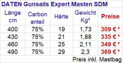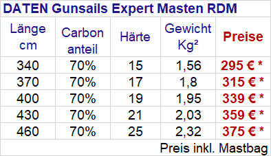 Gunsails Expert MastenPerformanceorientierte Mastlinie mit einem Carbonanteil von 70 % bis 75 % .Die Expert Linie mit einem Carbonanteil von 70% bis 75% ist für performanceorientierte Surfer und für alle die es gerne leicht aber auch bezahlbar haben möchten erste Wahl.Die Grössen ab 430 als SDM Variante haben 75 statt 70% Carbonanteil um die freerideperformance bei den grösseren Segeln hervorzuheben, da man mit dem höheren Carbonanteil eine bessere Rückstellkraft und Twistdynamik erzielt.Alle Expertmasten werden in der hochertigen PrepregCarbonbauweise gefertigt und haben eine Gewährleistung von 24 Monaten. Bei Uns die am meisten verkaufte „Standartmastlinie“, da die gunsails Segel und auch Masten im Vergleich zu anderen Marken recht günstig sind werden gerne die Expertmasten gekauft.Diese haben auch ein tolles Gewichts/ Preisverhältniss und mit dem hohen Carbonanteil auch eine sehr gute Performance; auch als Rigg- Upgrade interessant….Trotz des niedrigen Gewichtes sind die Masten ausreichend stabil, die Masten sehr zuverlässig.Ausführliche Infos zum Thema RDM oder SDM Mast sowie Carbonanteile und Masthärten findet Ihr auf unserer eigens dazu erstellten Service- Webseite Mastinfos