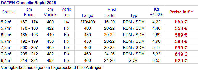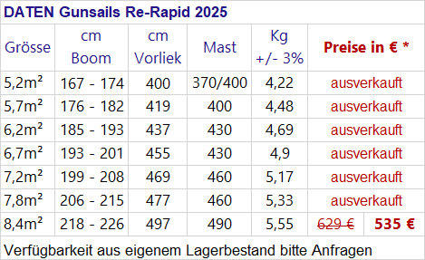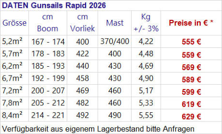 Das Gunsails Rapid 2025 ist das am meisten weiterentwickelte. camberlose Freeracesegel in der Gunsails Segelrange. Das neue steifere Masttaschenmaterial macht das Segel noch straffer und sportlicher. Dank ausgeprägtem Loose leech glänzt das Segel weiterhin mit gutem Handling und einem Racesegel- Speed, Feeling: Speed pur…! Der satte Zug beim Angleiten und die hohe Geschwindigkeit bei gutem Handling dank camberlosem Segel bilden den Grundcharakter des Segels. Neu in der Range ist die Segelgrösse 5,2m² zum komfortablen Starkwindheizen ohne Camber und stressfreien Wasserstart ohne ultrabreite Masttasche in allen Segelgrössen. Einfacher Aufbau und einfaches Handling ergänzen dieses Freeracesegel. Auch neu in 2025 die Variante Re-Rapid wobei ein Teil der Segelpaneele aus aufbereitetem Material besteht. Wird auch eingesetzt seit 2022 beim Modedll Re- Saeal als auch bei den Modellen Re-Torro und Re-Zoom Das Gunsails Rapid ist unsere Empfehlung für: freerider & freeracer die keine breite Masttaschen und/ oder Camber mögen, aber dennoch ein leistungsstarkes Segel mit gutem Handling bevorzugen.